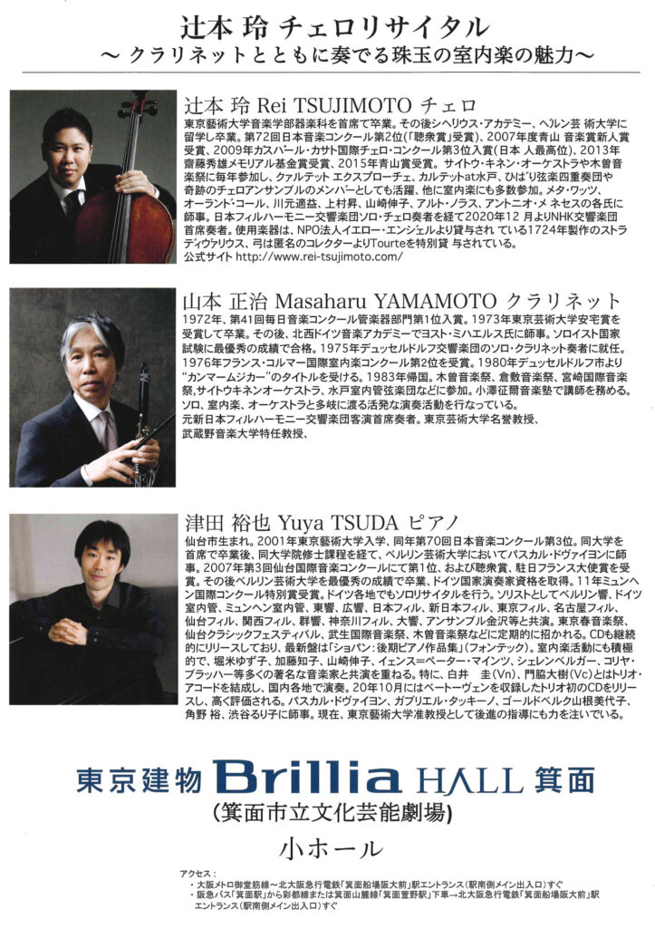出演…辻本玲さん(チェロ)、山本正治さん(クラリネット)、津田裕也さん(ピアノ)