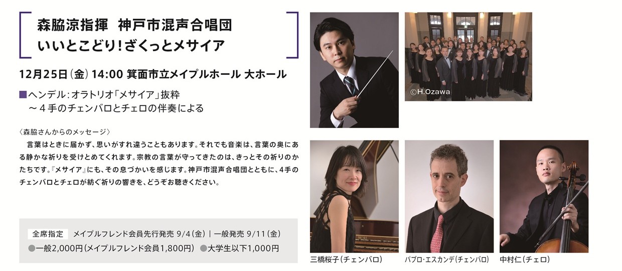神戸市混声合唱団とともに、4手のチェンバロとチェロが紡ぐ祈りの響きを、どうぞお聞きください。