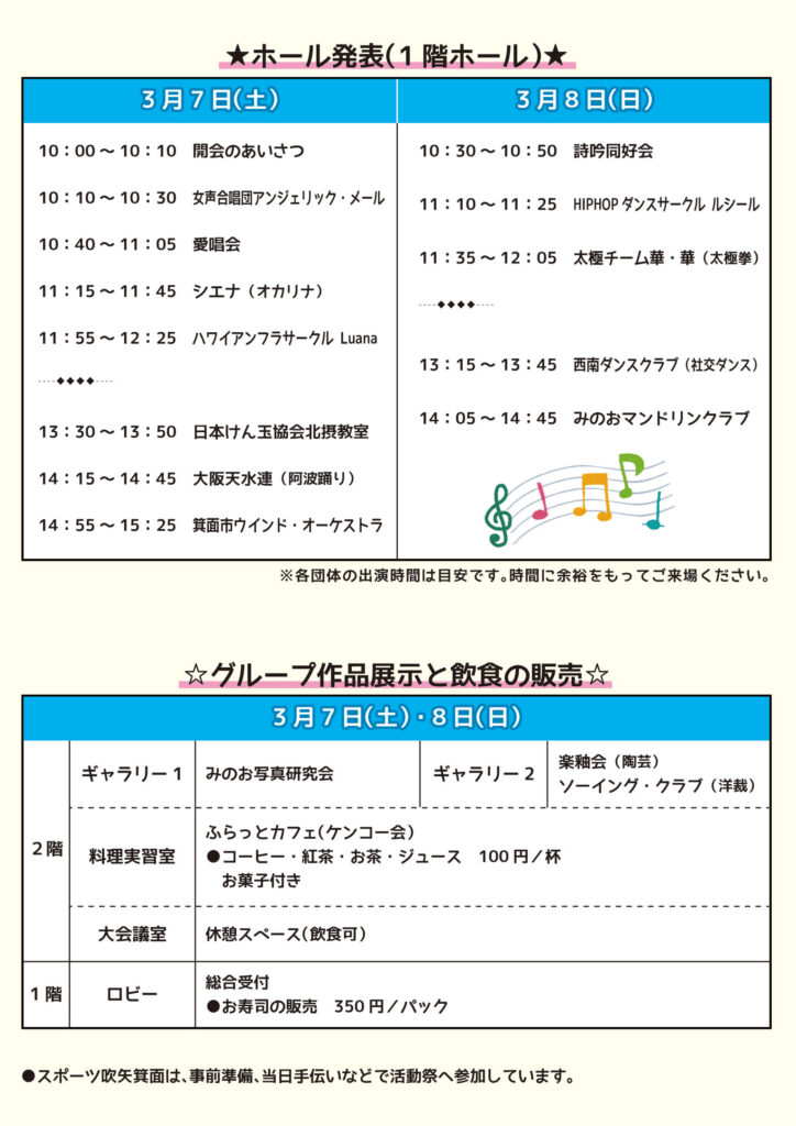 合唱・演奏・ダンスなどの舞台や、写真・陶芸・洋裁の展示で日頃の活動の成果を発表します。お寿司の販売やカフェもありますのでお気軽にお立ち寄りください。