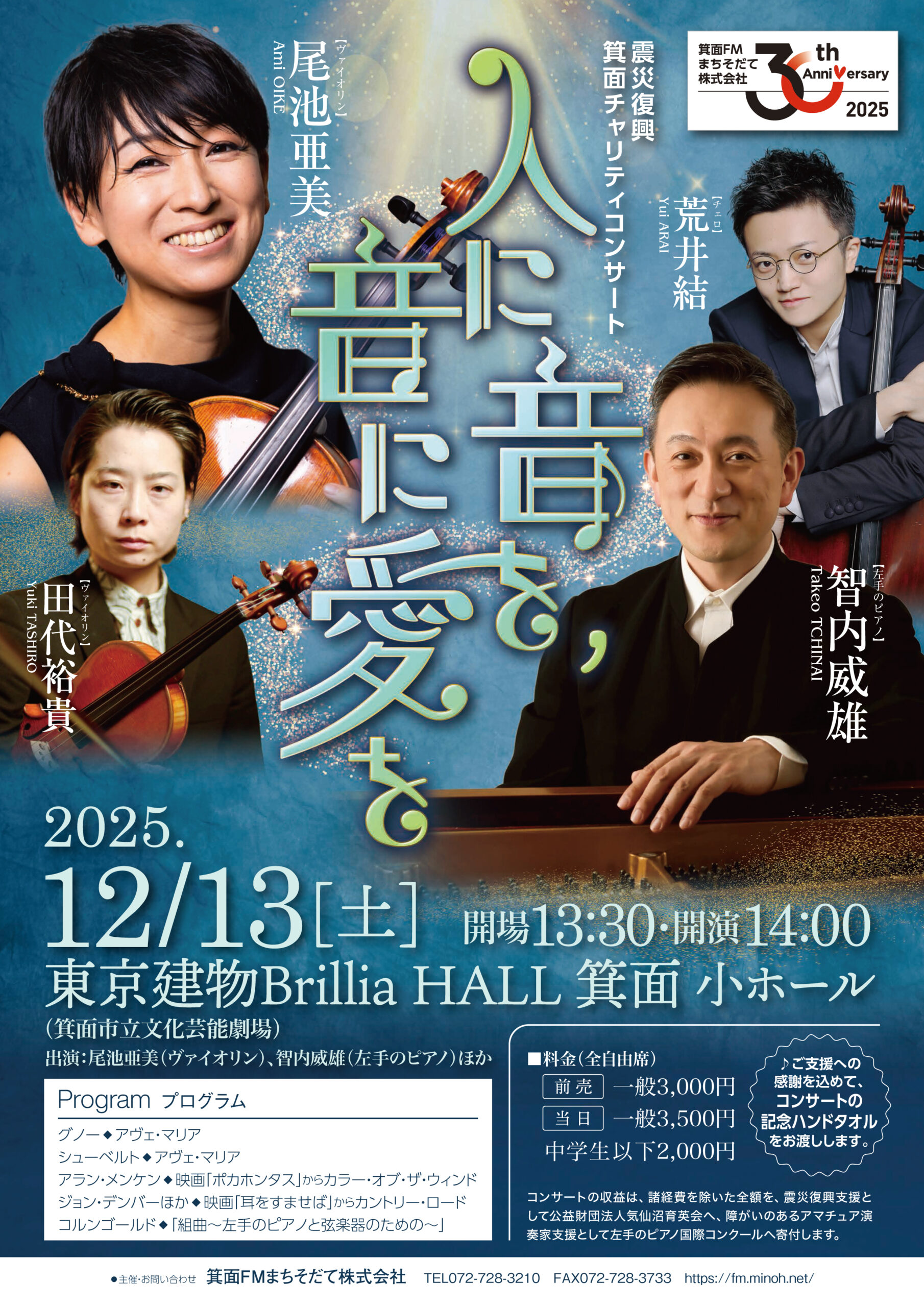 東日本大震災発生以降、4回目となるチャリティコンサートを、今回は、東京建物 Brillia HALL 箕面(箕面市立文化芸能劇場)で開催します。